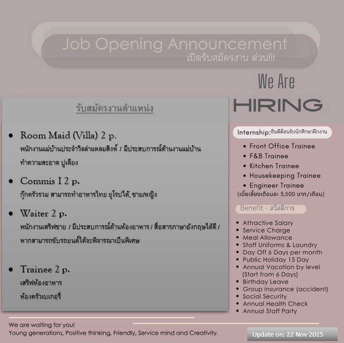 สนใจร่วมงานกับเรา สามารถส่ง Resume มาที่ [email protected] ยินดีต้อนรับทุกท่านค่ะ