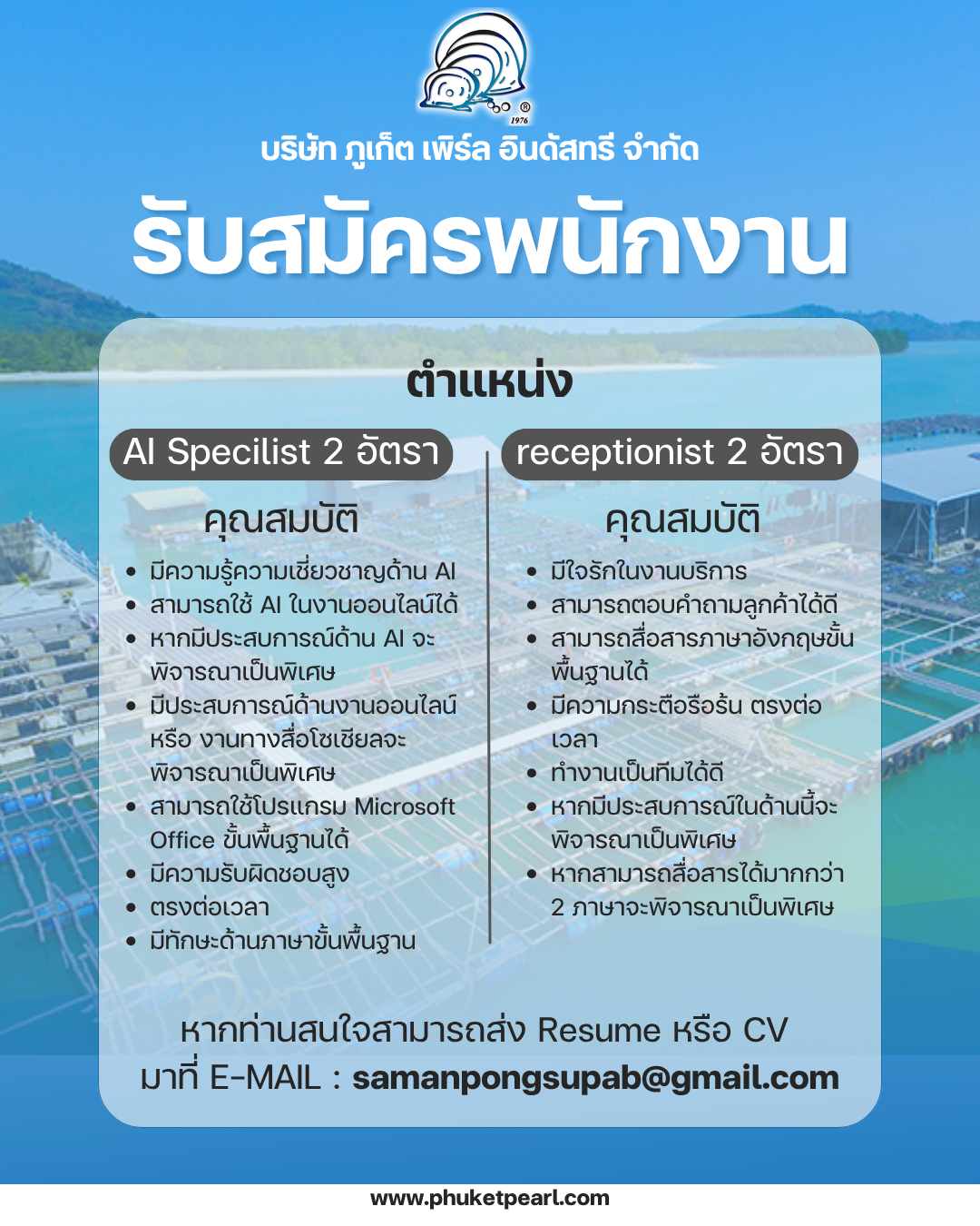 กรุณาส่งประวัติส่วนตัวมาที่ [email protected] หากท่านผ่านการพิจารณาเราจะติดต่อไปเพื่อนัดสัมภาษณ์