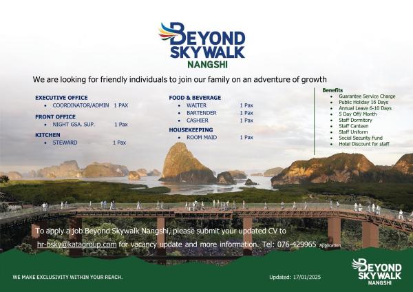 Skywalk Nangshi” (บียอนด์ สกายวอล์ค นางชี) สัมผัสประสบการณ์จุดชมวิว “สกายวอล์คกระจก” หรือทางเดินลอยฟ้าใหม่ล่าสุด เปิดประตูต้อนรับนักเดินทาง สถานที่ท่องเที่ยวแห่งแรกที่ไม่เหมือนใครในจังหวัดพังงา ประเทศไทย กับวิวทะเลอันดามันและเทือกเขาเสม็ดนางชีอันงดงามที่ไม่มีใครเทียบได้