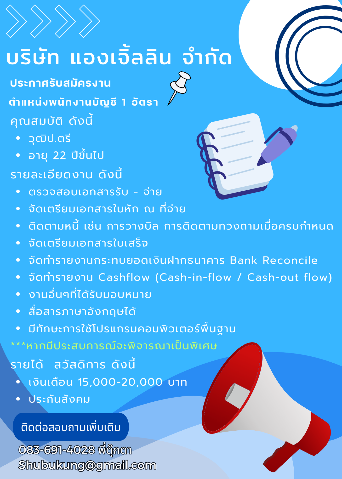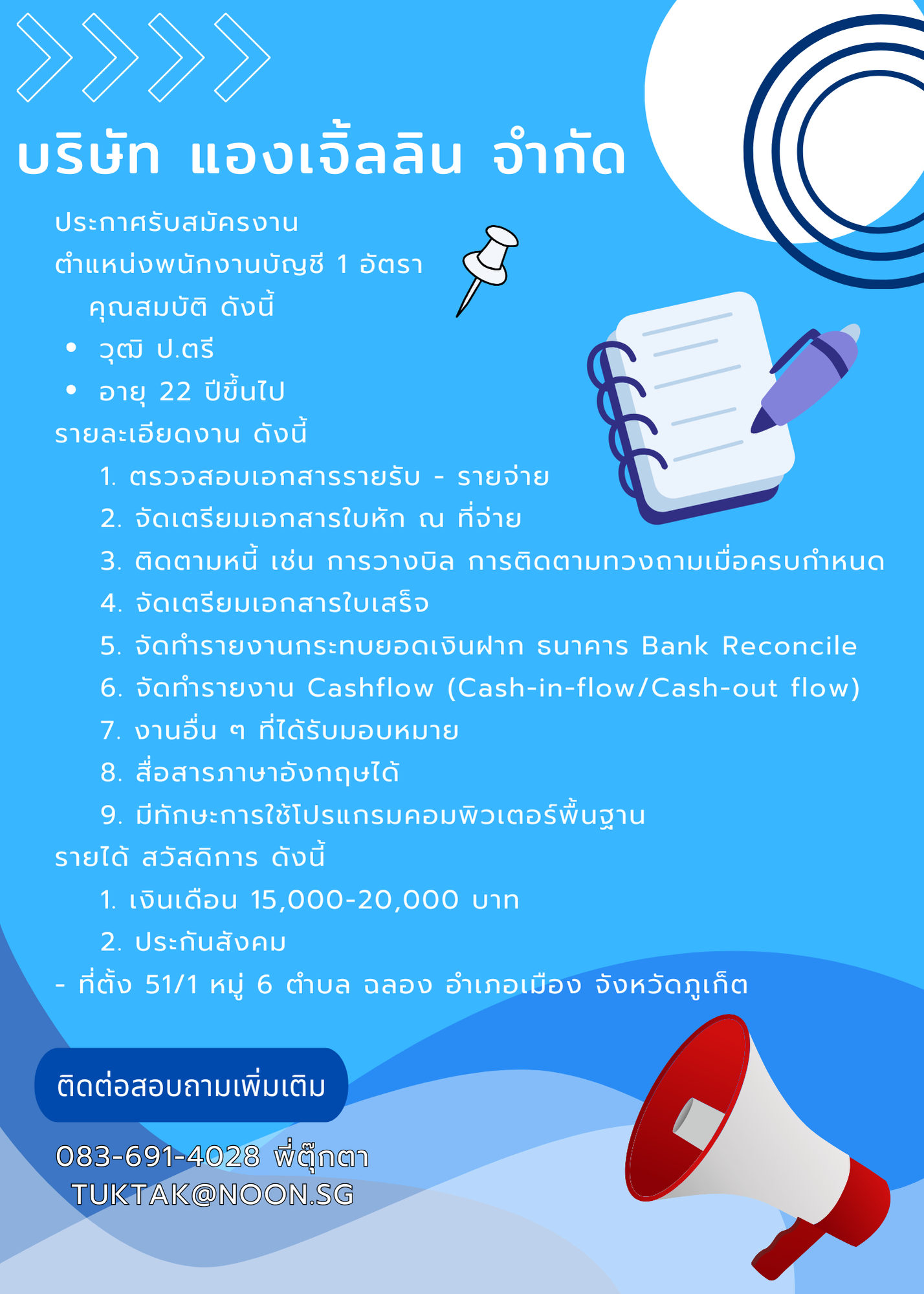 เปิดรับสมัครงานหลายอัตรา !! สนใจสมัครงานโทร 088-7660331 หรือ [email protected]