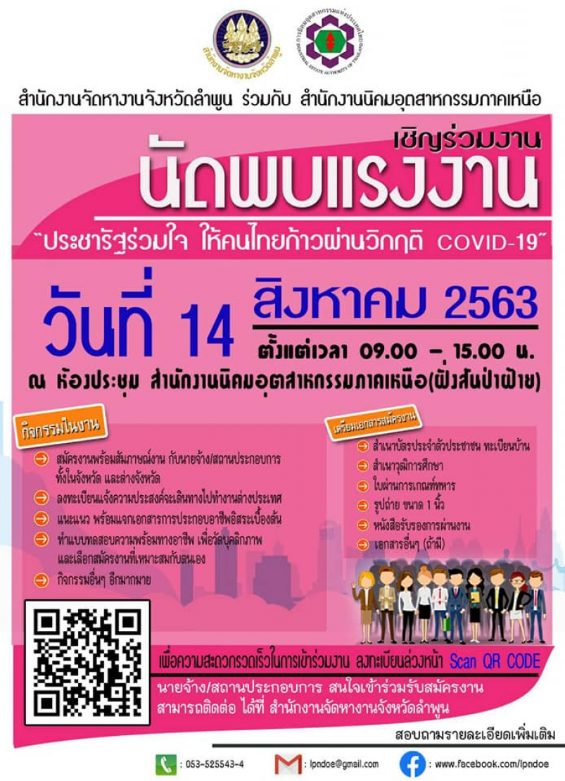 ลำพูน - #จัดหางานจังหวัดลำพูนขอเชิญร่วมงาน "นัดพบแรงงาน ประชารัฐร่วมใจ ให้คนไทยก้าวผ่านวิกฤติ COVID-19"