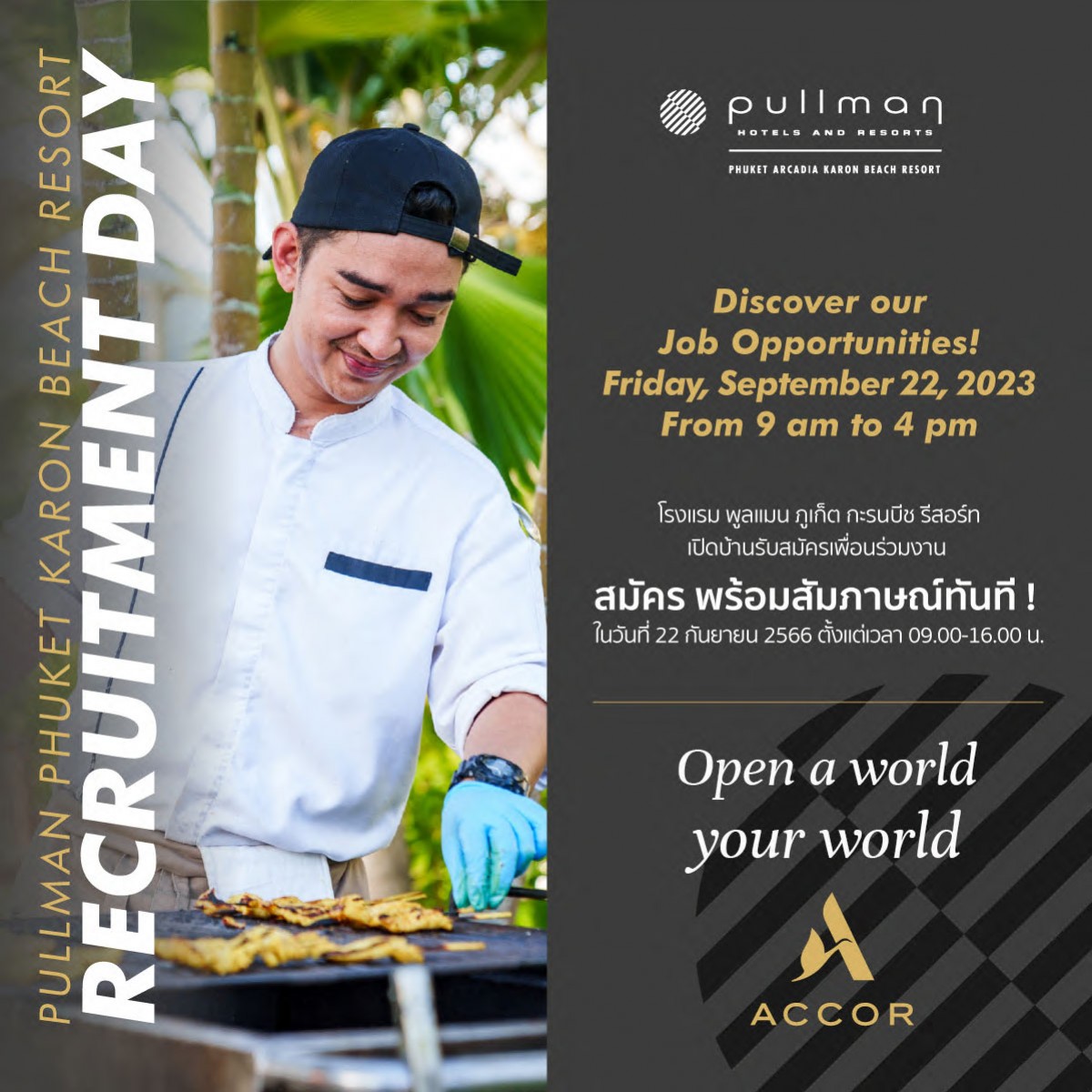 Discover our Job Opportunities! Friday, September 22, 2023 From 9 am to 4 pmโรงแรม พูลแมน ภูเก็ต กะรนบีช รีสอร์ท เปิดบ้านรับสมัครเพื่อนร่วมงาน