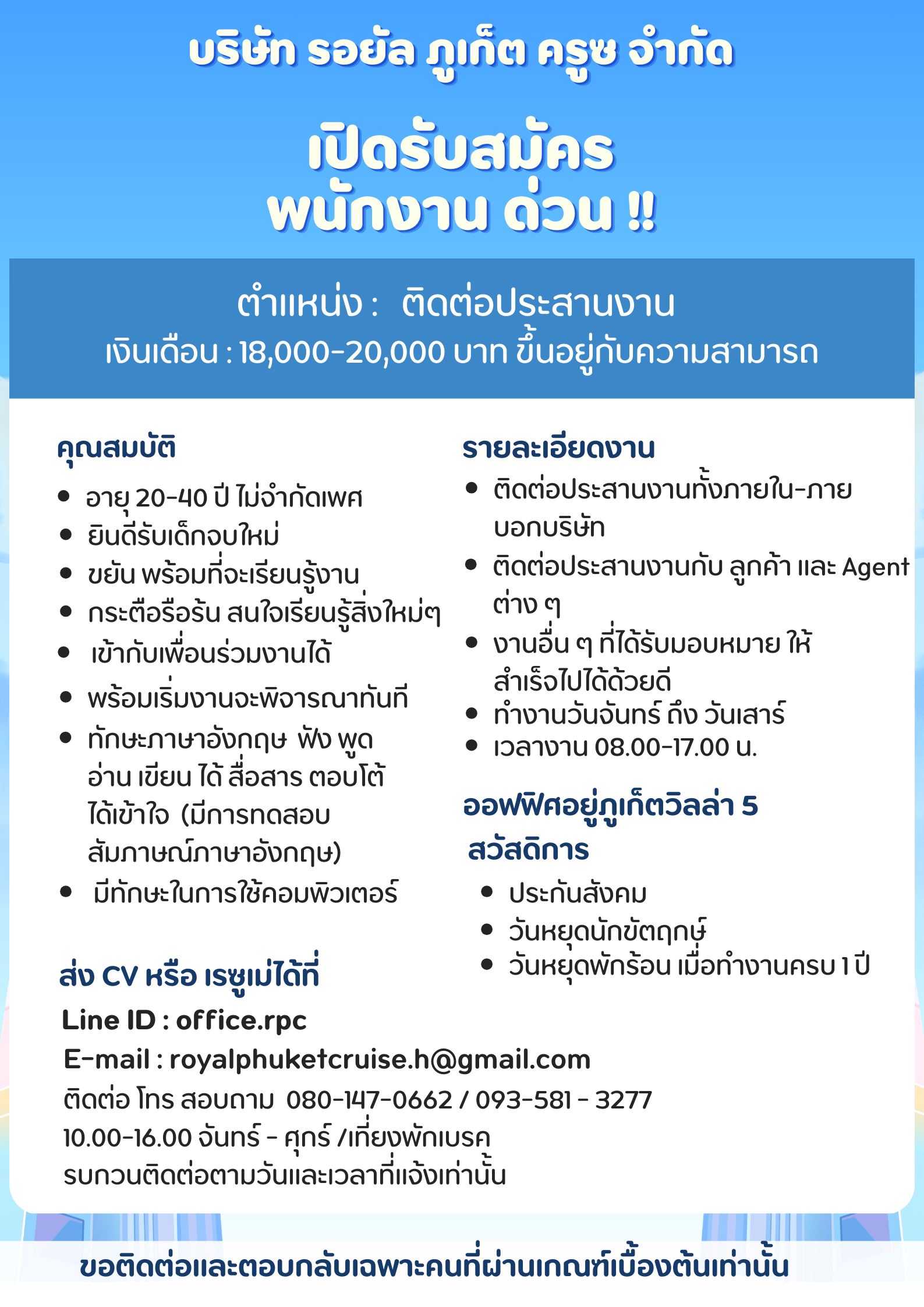 กรุณาส่งประวัติส่วนตัวมาที่ [email protected] หากท่านผ่านการพิจารณาเราจะติดต่อไปเพื่อนัดสัมภาษณ์