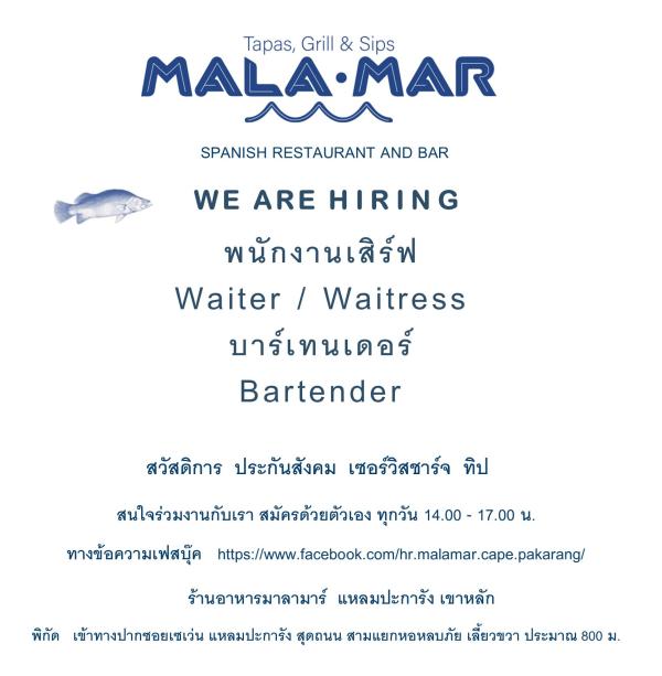 เดินทางมาสมัครด้วยตนเองพร้อมสัมภาษณ์เบื้องต้น ได้ที่ร้าน มาลามาร์ แหลมปะการัง 14.00-17.00 น.