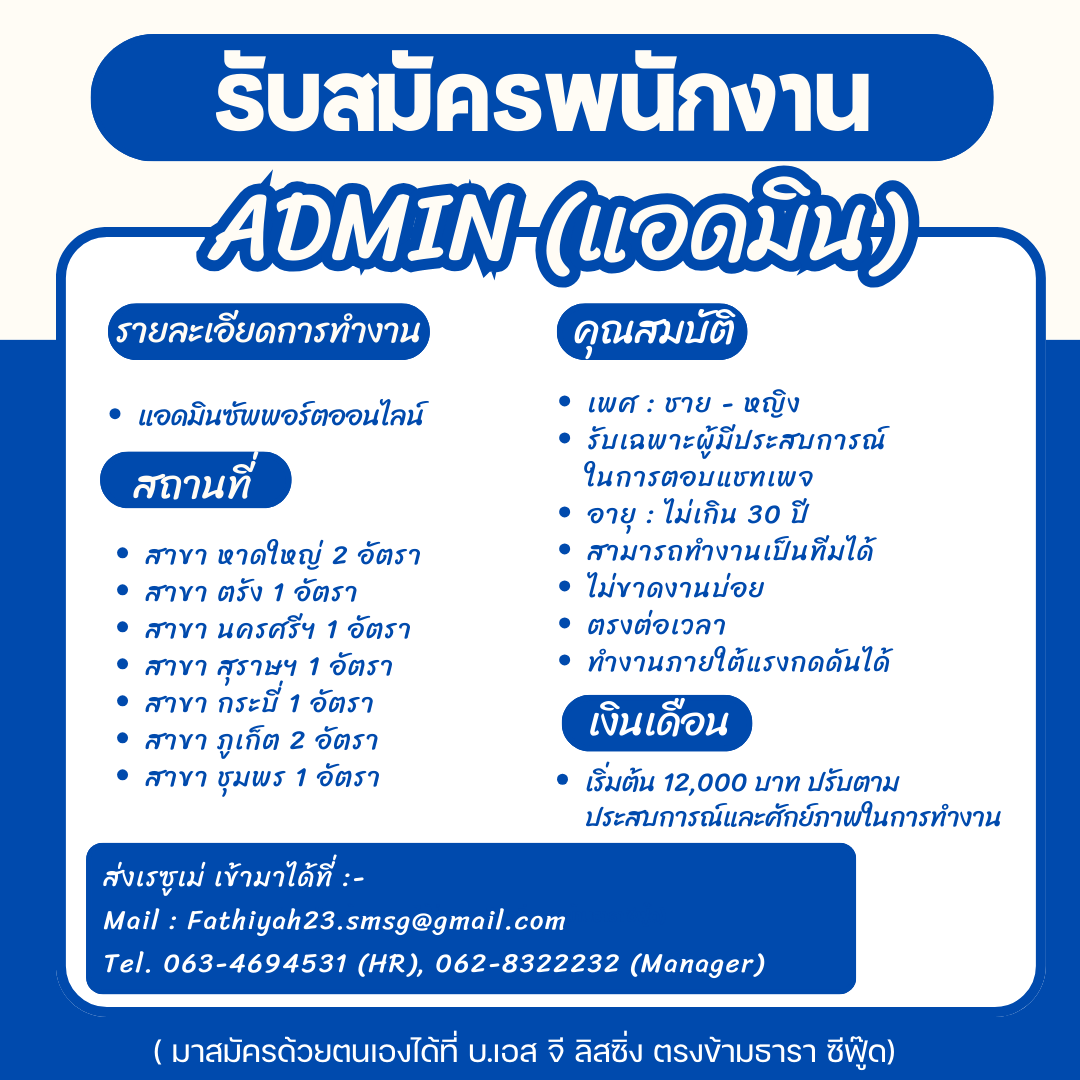 ด่วน รับสมัคร แอดมินประจำสาขา
