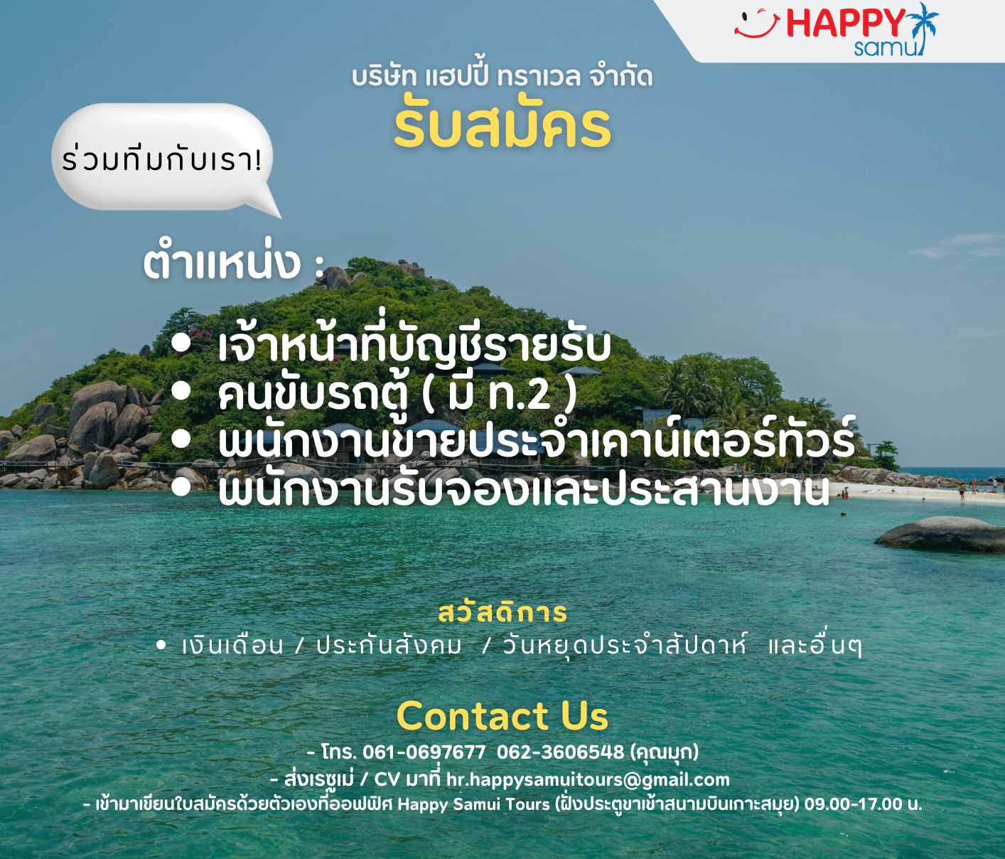 บริษัท แฮปปี้ ทราเวล จำกัด กำลังมองหาเพื่อนร่วมงานรายละเอียดตามด้านล่างนี้ค่ะ