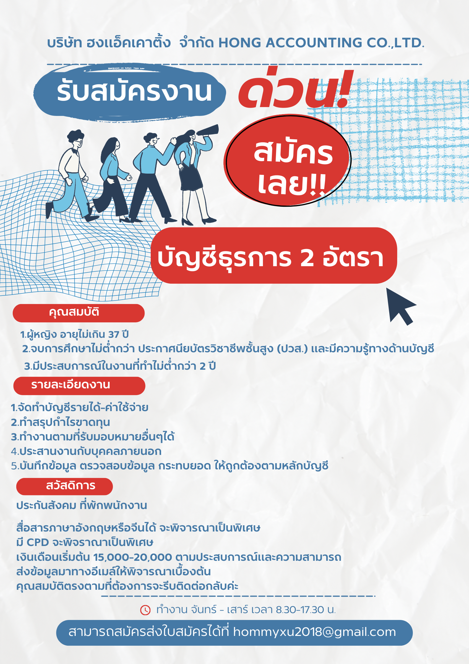 กรุณาส่งประวัติส่วนตัวมาที่ [email protected] หากท่านผ่านการพิจารณาเราจะติดต่อไปเพื่อนัดสัมภาษณ์