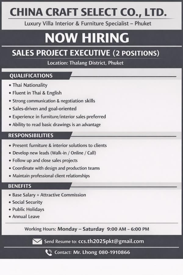 ประกาศรับสมัครพนักงาน Sales project (ขายเฟอร์นิเจอร์ ) จำนวน 2 อัตรา