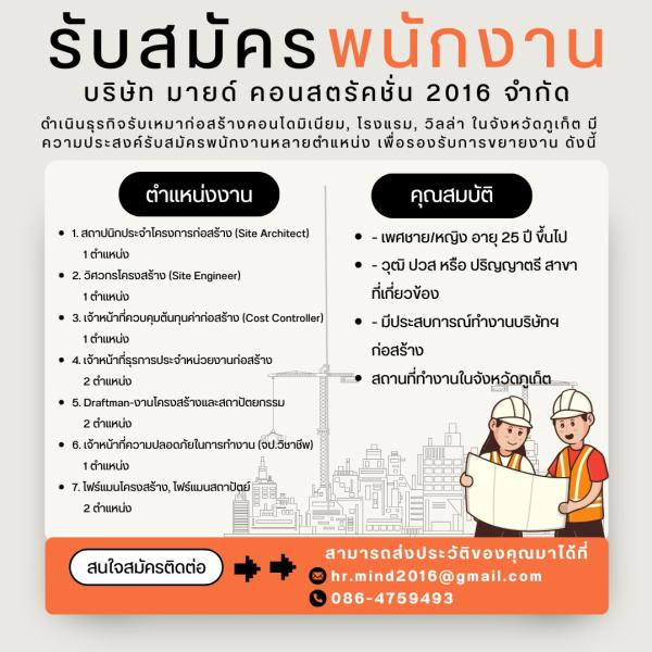 ดำเนินธุรกิจรับเหมาก่อสร้างคอนโดมิเนียม, โรงแรม, วิลล่า ในจังหวัดภูเก็ต มีความประสงค์รับสมัครพนักงานหลายตำแหน่ง เพื่อรองรับการขยายงาน ดังนี้